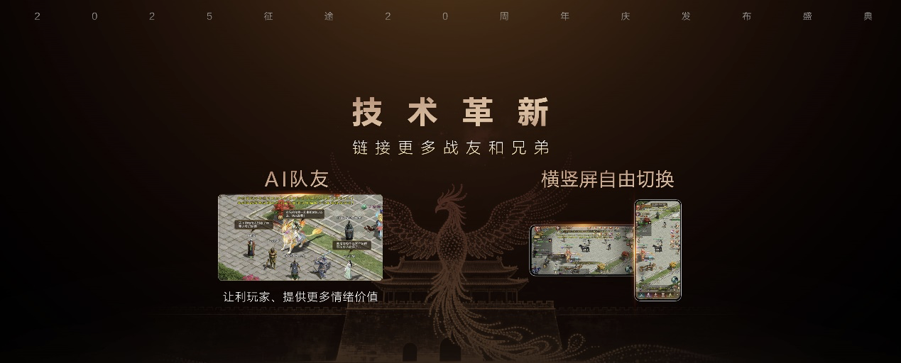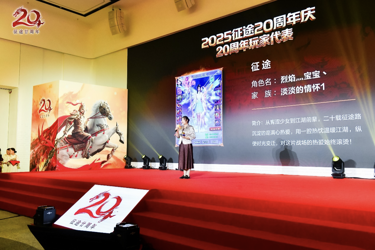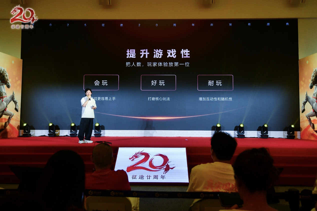 回望过去,放眼现在,征途也将继续展望未来。在主持人介绍下,征途IP赛道负责人赵剑枫上台,为大家带来了以“尊重玩家,全面改革,再战20年”为主题的征途20周年发布会。发布会上,赵剑枫与玩家们分享了二十载征途,专属于征途人的青春记忆,小到一张合影,大到一场国战都历历在目。