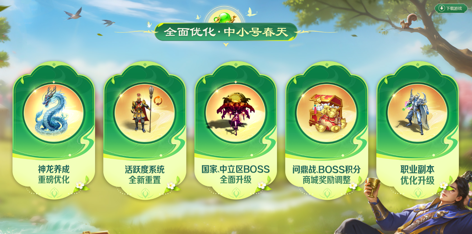 聚焦中小号玩家游戏体验,本次版本将持续对核心玩法进行优化焕新,以“减负提效、收益升级”为原则,打造更适配中小号玩家的畅玩体系。神龙养成玩法即将迎来重置优化,大幅砍掉多余操作步骤,让玩家轻松培养强力神龙!活跃度系统全新升级,玩家将通过更轻松的节奏享受到专属福利!国家、中立区BOSS也将全面升级奖励收益,让玩家的每一次参与都有满满收获!