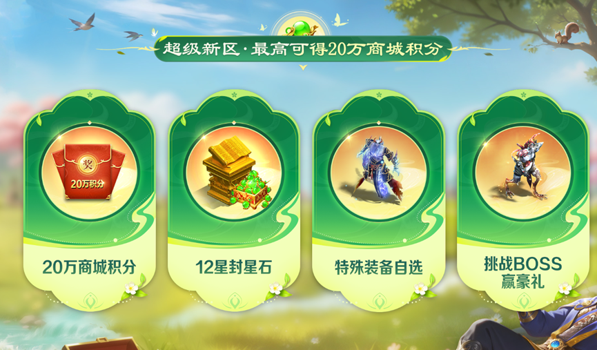 本次版本上线的超级新区,成为中小号玩家快速成型的主阵地!多重专属福利拉满,成长爽感激增!新区组队即可解锁价值20万元的商城积分,神器、圣衣等珍稀豪礼随心兑换!每日还可参与日历签到,免费获取12星永久封星石!更有限时任务,完成就送特殊装备自选礼盒,击杀 BOSS掉落海量非绑道具,打宝致富两不误!