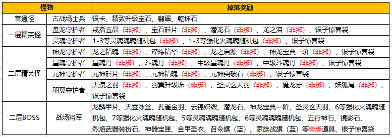 玩家在古战场中击杀各类怪物,除了有机会获得绑定的银子惊喜袋外,更有机会获得各怪物掉落的非绑道具奖励。具体奖励如下: