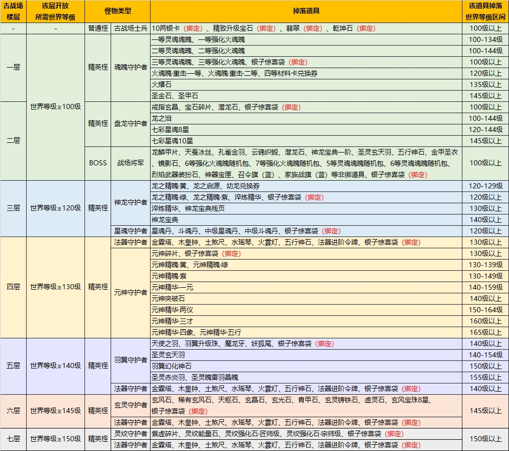 世界等级≥100级且等级≥100级的玩家,可在中立区NPC古战场入口(835,665)消耗一定的银子进入古战场。根据世界等级不同,玩家可前往古战场的楼层也会有所区别。古战场每一层都会刷新普通怪、精英怪,二层还将额外刷新BOSS。